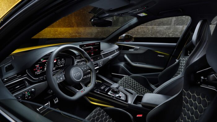 In terms of design, it's pretty easy to differentiate the 25th Anniversary Edition from the rest. The color gives it away Imola Yellow in honor of the 2001 RS4 Sport, although it can also be chosen in Mythos Black. There are also a series of glossy black details, including some unprecedented ones such as those on the side windows or those on the rear lights. It extends to the logos of the four rings and the roof bars are eliminated to gain sportiness. There is no lack of special edition registrationsomething that extends to the interior with a black/yellow combination in its RS bucket seats with honeycomb stitching and the carbon backrest