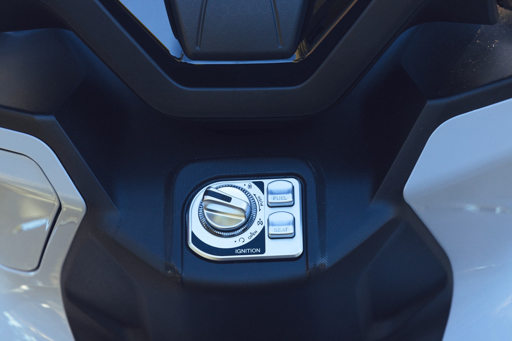 Other premium details include folding mirrors and lighting Full LED High visibility, with the indicators elegantly integrated into the bodywork. The space under the seat is generous, allowing you to accommodate two helmets (an integral and a jet), an outstanding carrying capacity for a scooter in this category.